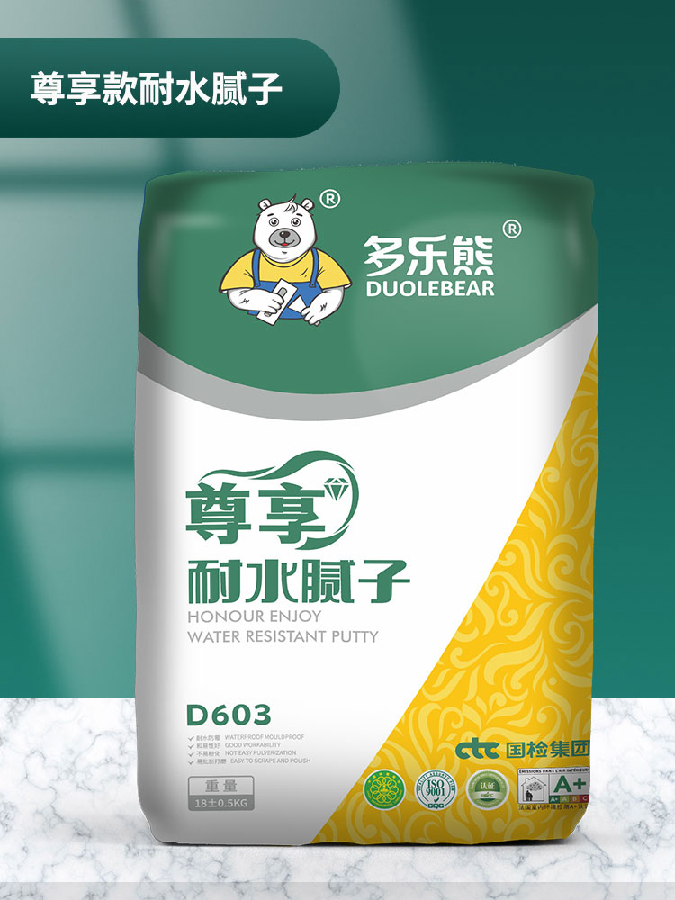 多乐熊尊享耐水腻子是一种水泥基耐水墙面找平材料,呈碱性。精白细腻、和易性好、易批刮、易打磨、耐水防霉、不易粉化、二次装修基层不需要铲除处理。适用于室内墙体面层批刮找平。